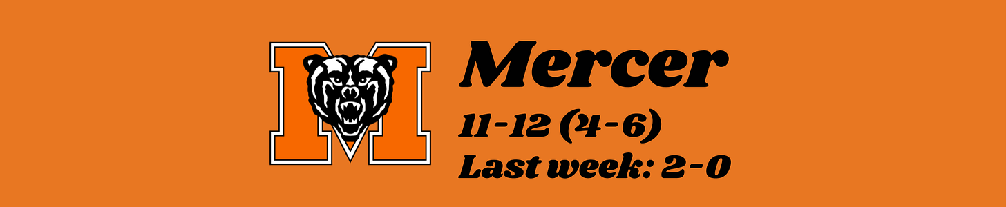 Rather quietly, Mercer has overcome an 0-5 start to conference play and landed itself squarely in the scrum for fourth place. The Bears haven’t necessarily been convincing lately—they let ETSU take them to overtime with a 6:08 scoring drought to end regulation, then went back and forth with The Citadel most of the way—but they’re banking wins in a crucial run against the SoCon’s more beatable teams, and that’s all they need right now. The rest of the way is daunting, but Mercer’s in a much better position than they were a couple weeks back.