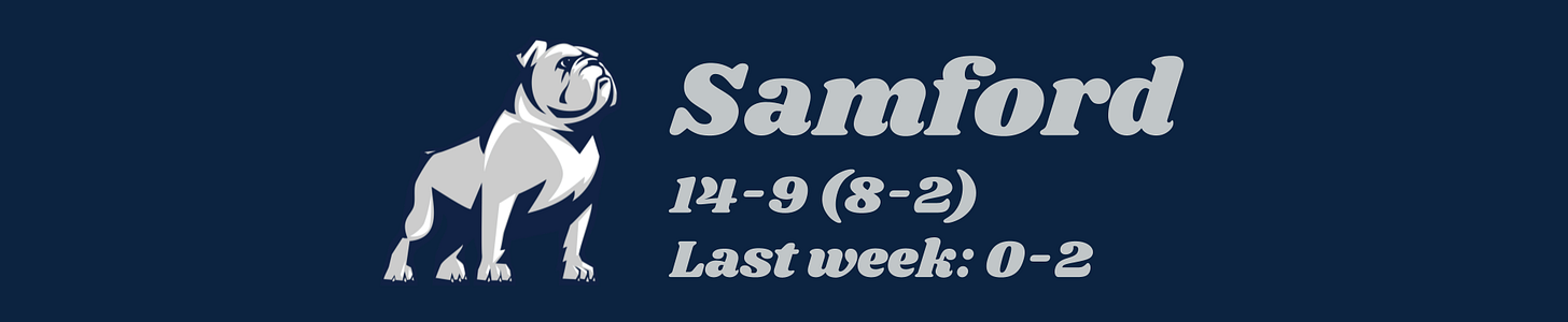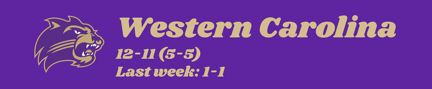 Speaking of Wofford, let’s give them their flowers for a very strong week that also featured a road win over Chattanooga. It’s been a bumpy road for Dwight Perry since he took over from Jay McAuley in early December, but he’s done a remarkable job under the circumstances to put the Terriers in the running for a top-five finish. The monumental win at Texas A&M earlier this season was a proof of concept for what they could do with a tournament spot, but knocking off 8-1 Samford is just as key to demonstrate that they can make serious noise in Asheville. It’s a long way from here to the coveted #4 and #5 seeds that avoid a quarterfinal matchup with the top three, but Wofford has clearly established itself as a force to be reckoned with.