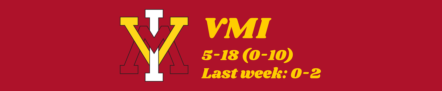It’s an unpleasant topic, but we have to face it sooner or later: where can VMI get a win and avoid a winless season in SoCon play? Going on the road to do so against The Citadel, despite the fact that they couldn’t defend home court against Chicago State, seems like a tall order. None of the remaining opponents at Cameron Hall—Furman, Chattanooga, Samford, and Wofford—seem like great targets, though the Mocs might be vulnerable if Stephens hasn’t returned in a couple weeks’ time. The best opportunity might actually be in the SoCon tournament, when the Keydets will be at a neutral site facing a bottom-four team that probably finished the season on a losing skid. The odds still say they should win somewhere, but they’re running out of chances.